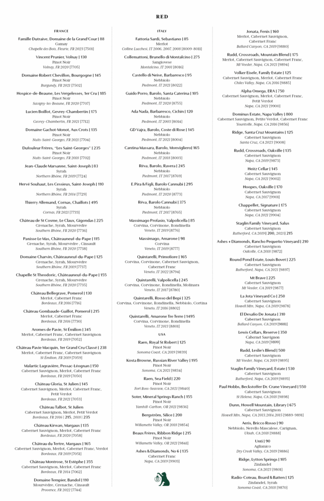 Every label on the list is a bottle that we are happy to enjoy at our own table. Each has enough power and personality to stand alone but also to complement the dishes on Chef Brett’s menu. We’re thrilled to provide selections to suit your personal taste, and for your picnic, in-room, or evening meal.